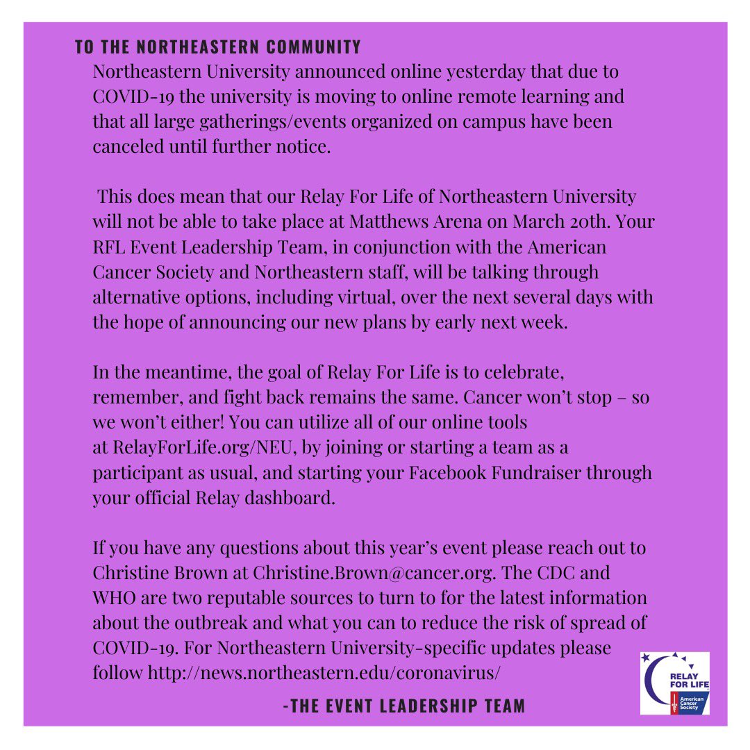 Relay For Life Northeastern : Relay For Life At Northeastern Photo By Leedj03 Photo Alma Mater Instagram Posts : See more of relay for life northeastern ct on facebook.. Relay for life of mit. Whether you're a current northeastern student or an alumni, we have a team for you! We are less than 24 hours away from our first ever virtual event! Each relay has special events and activities (many throughout the year) just for survivors and their caregivers, so they can connect with others and know there is a strong support system available to them. Content not working due to cookie settings.