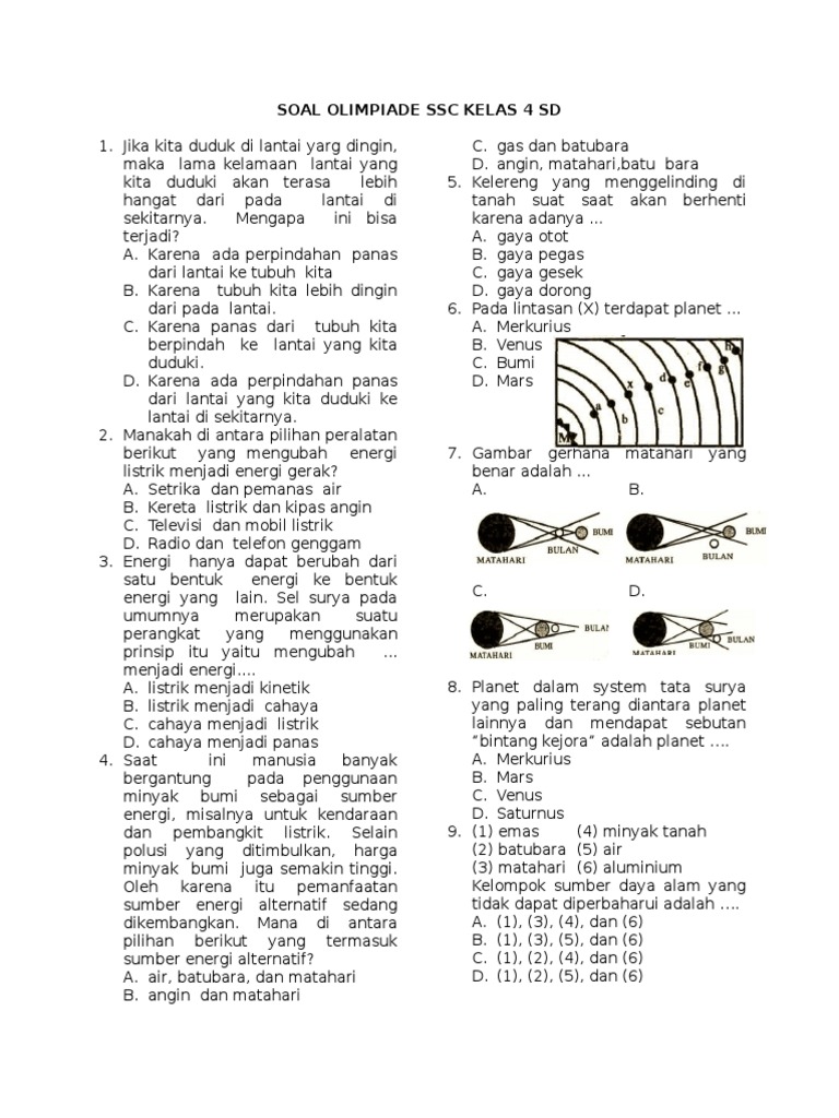 Soal cerdas cermat matematika sd. Berdasarkan pada silabus olimpiade sains nasional (osn) sekolah menengah pertama tahun 2018, bahwasannya silabus olimpiade sains nasional tingkat kesulitan tersebut dibuat berjenjang, soal untuk tingkat provinsi relatif lebih sulit dibandingkan tingkat kabupten/kota, dan soal tingkat. Olimpiade sains nasional adalah ajang berkompetisi dalam bidang sains bagi para siswa pada jenjang sd, smp, dan sma di indonesia. Setelah menyelesaikan semua soal klik lihat nilai untuk mengetahui nilai kalian. Kemampuan kelelawar dapat mengetahui pada lingkungan sekitarnya dengan menggunakan system sonar.